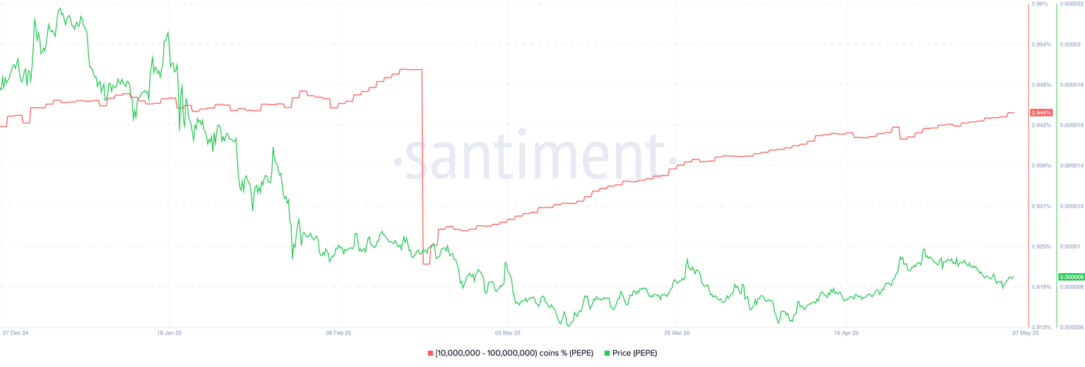 This outlook has seen Pepe’s price steadily rebound from the tariff-triggered crash in April, backed by increasing demand from large volume investors. According to Lookonchain, a platform tracking large blockchain transactions, a whale purchased 500 billion PEPE valued at approximately $4.36 million. This particular whale holds a total of 2 trillion PEPE, worth roughly $17.42 million.