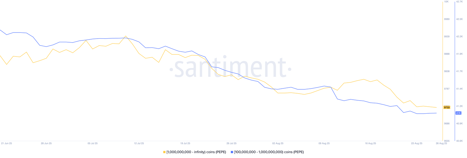 Similarly, cohorts with over 1 billion PEPE have declined to 9725, from the monthly high of 9815 on August 15.
