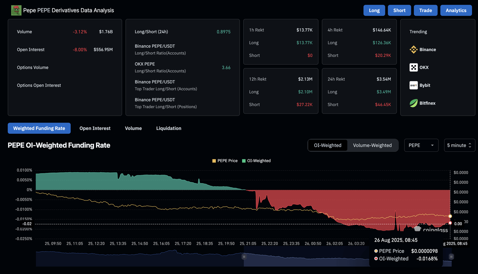 CoinGlass data indicates that the PEPE Open Interest has declined by 8% over the last 24 hours, reaching $556.95 million. A capital outflow of such a degree, due to liquidations or the closing of PEPE futures or options contracts, suggests declining investor confidence, as market sentiment shifts to risk-off.