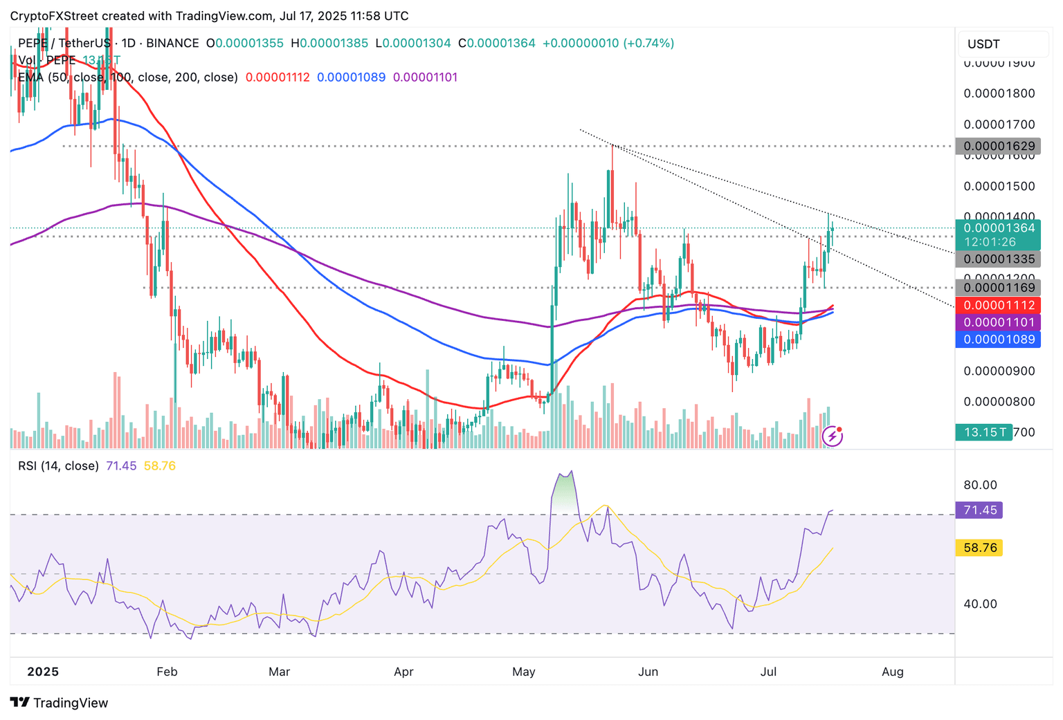 Pepe (PEPE) shows signs of consolidating at around $0.00001364 on Thursday, following a falling wedge pattern breakout, which reached the intended target slightly above $0.00001400 the previous day.