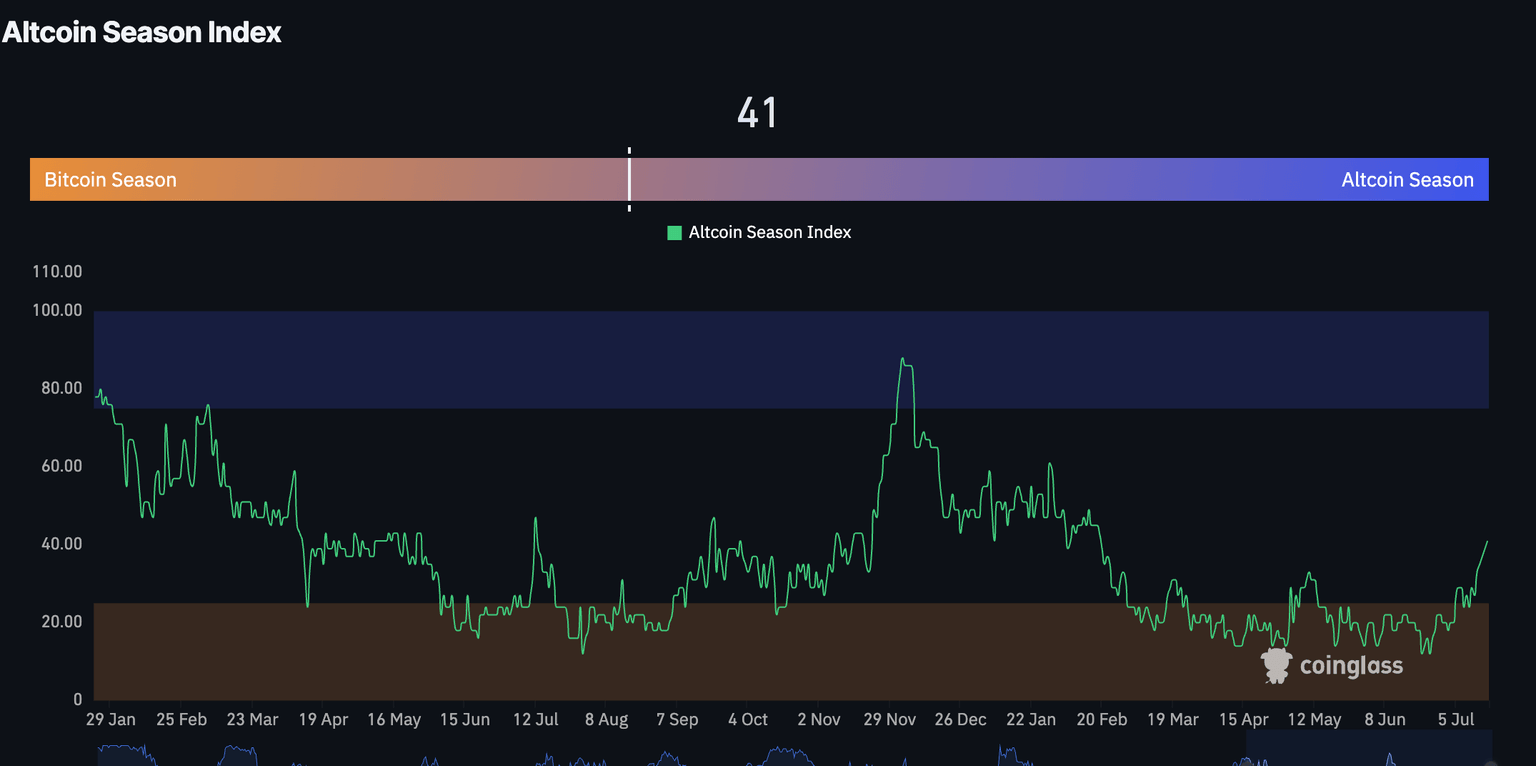 The Altcoin Season Index has steadily been growing over the past few weeks, rising from 12 on June 22 to 41 at the time of writing. Although this index is still far from signaling the start of the altcoin season, which typically occurs around 75, this recent growth suggests that retail investors are making a comeback with renewed interest in alternative investments to Bitcoin.