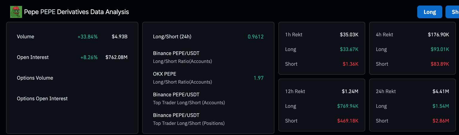 A subsequent surge in the derivatives market's trading volume by 34% to nearly $5 billion indicates heightened market activity and trader confidence in PEPE and its ecosystem. This indicates that traders are willing to bet on the Pepe price extending its recovery above the short-term hurdle at $0.00001400 in the near term.