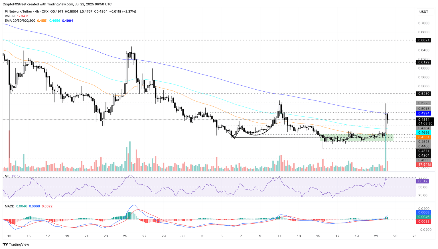 On the downside, if PI fails to hold grounds above the 100-period EMA at 0.4656, it could extend the declining trend to the 50-period EMA at $0.4551.