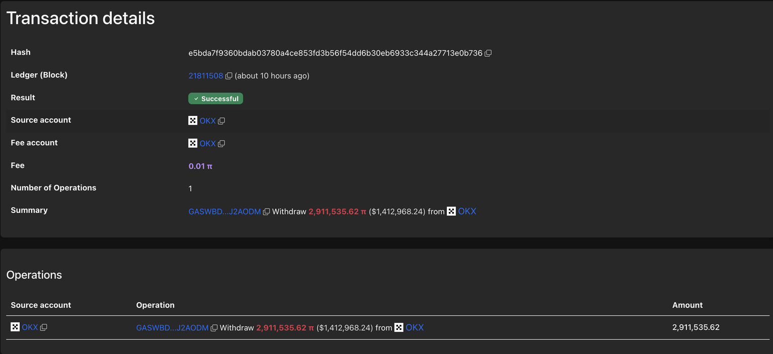 PiScan data shows that the largest transaction over the last 24 hours is the withdrawal of 2.91 million PI tokens, worth $1.41 million, to the “GASWBD…J2AODM” wallet from the OKX exchange. Typically, such high-volume withdrawals reflect the confidence of whales.