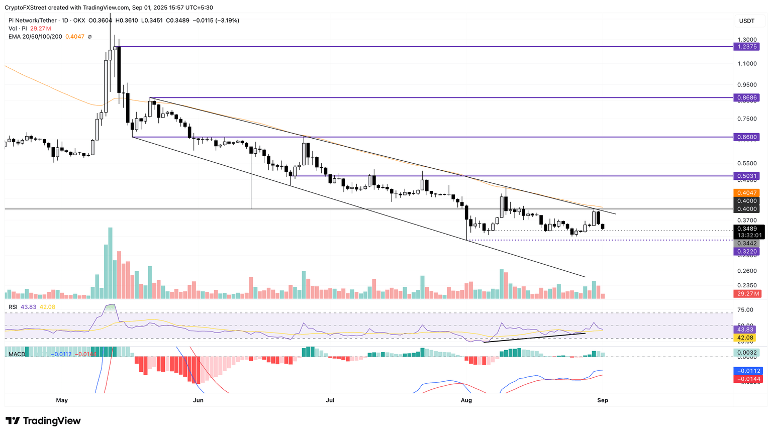 Looking up, Pi Network should reclaim the 50-day Exponential Moving Average (EMA) at $0.4047, which is moving closely with the falling channel pattern’s overhead trendline. If so, the uptrend could target the $0.5000 psychological level.