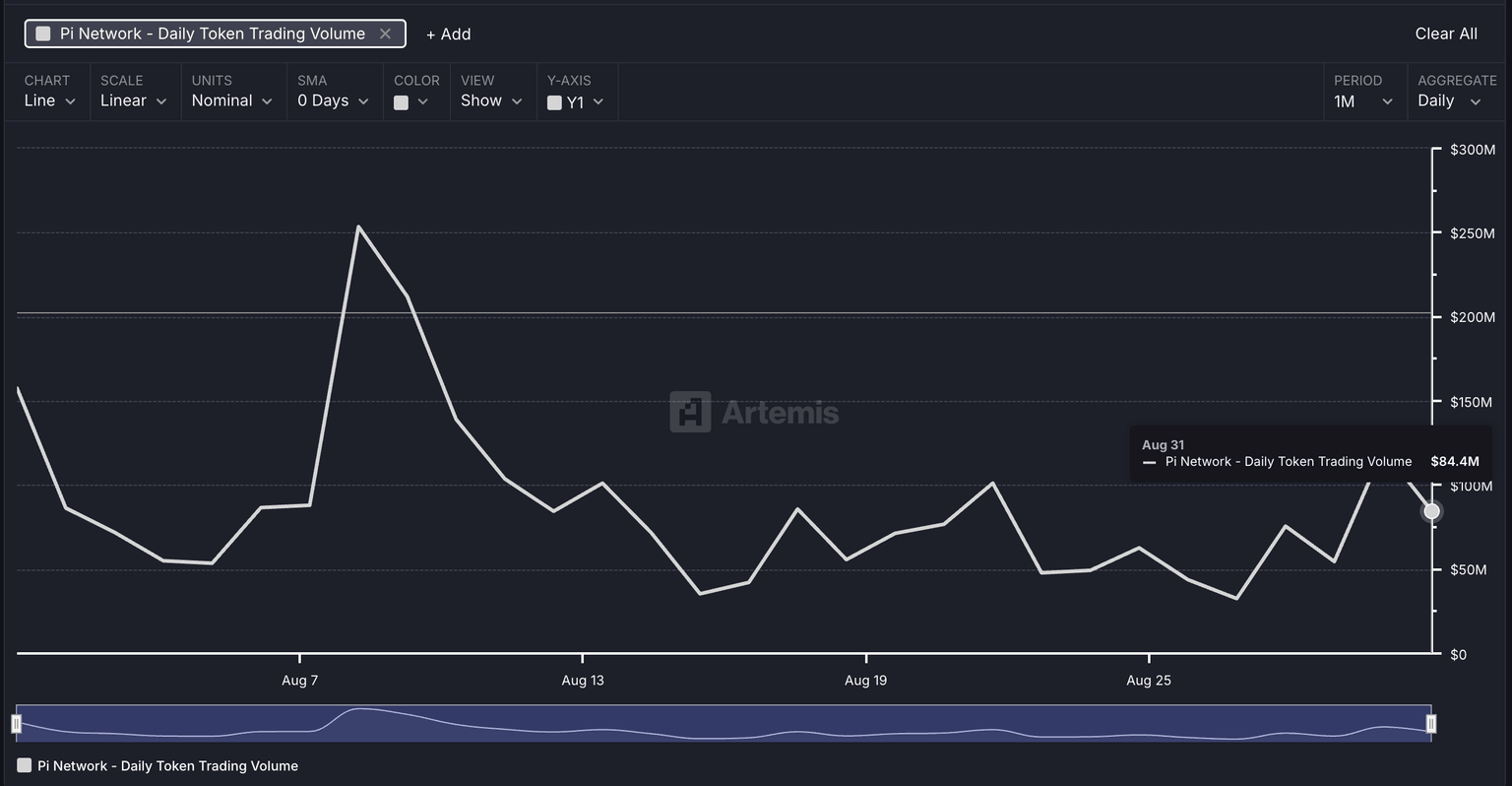 The massive outflow indicates heightened withdrawals from the CEXs, signaling confidence among traders. Still, the Artemis data on daily PI token trading volume suggests a potential stagnation between $50 million and $100 million since mid-August.