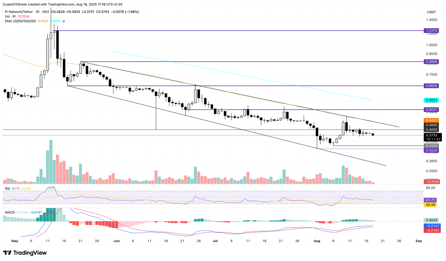 PI token edges lower by over 1% at press time on Monday within a falling wedge pattern on the 4-hour chart. The declining trend marks a shift from the short-lived consolidation near the $0.40 level.