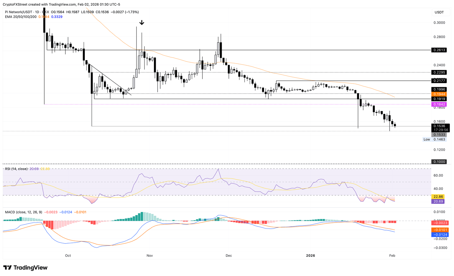 Pi Network hovers above $0.1500 at press time on Monday, trading in the red for the third straight day. PI extends the pullback from the 50-day Exponential Moving Average (EMA) at $0.1944 toward the $0.1463 record low hit on Saturday, reinforcing a bearish alignment.