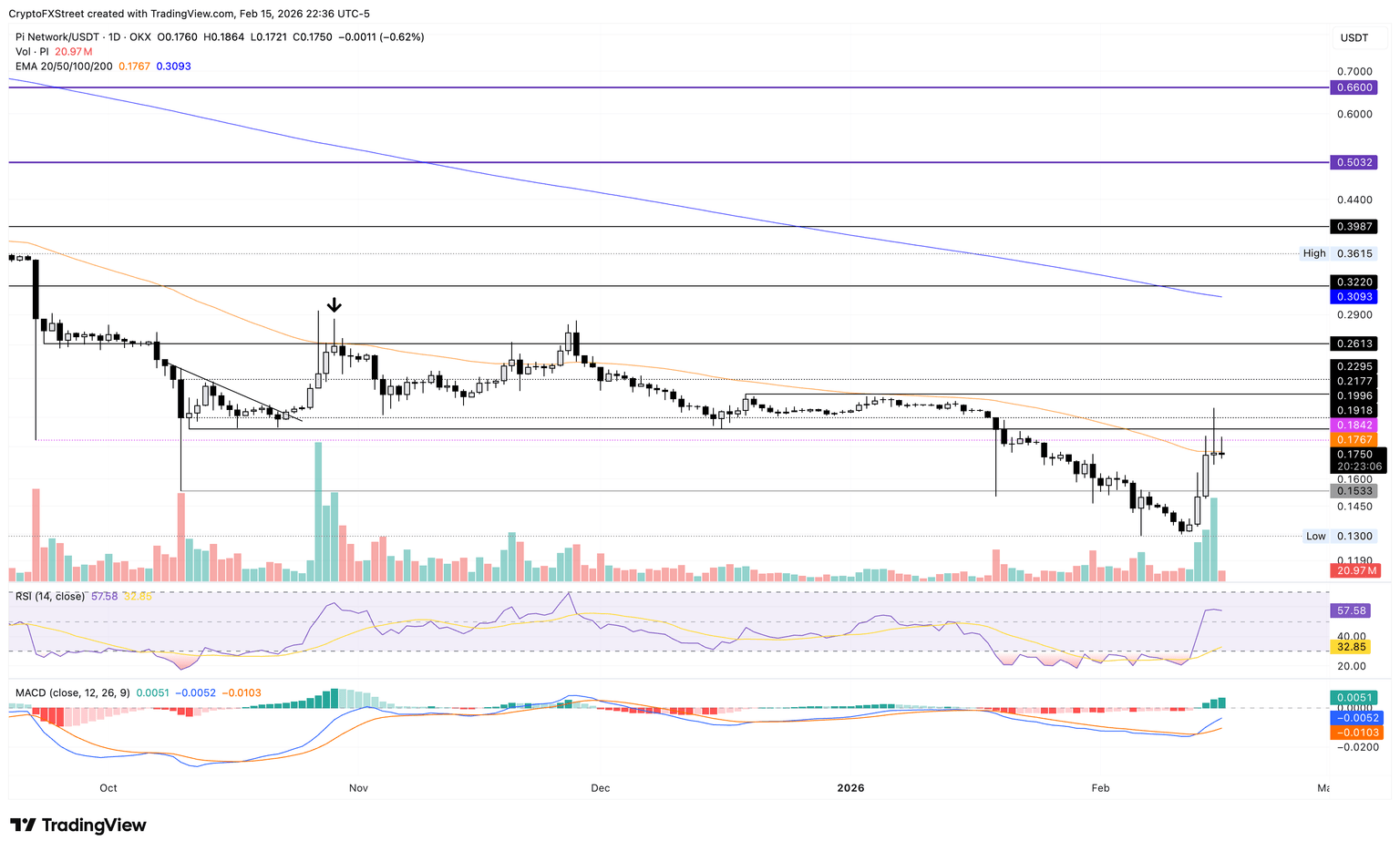 - Pi Network holds steady near the 50-day EMA at $0.1767 after four consecutive days of recovery.