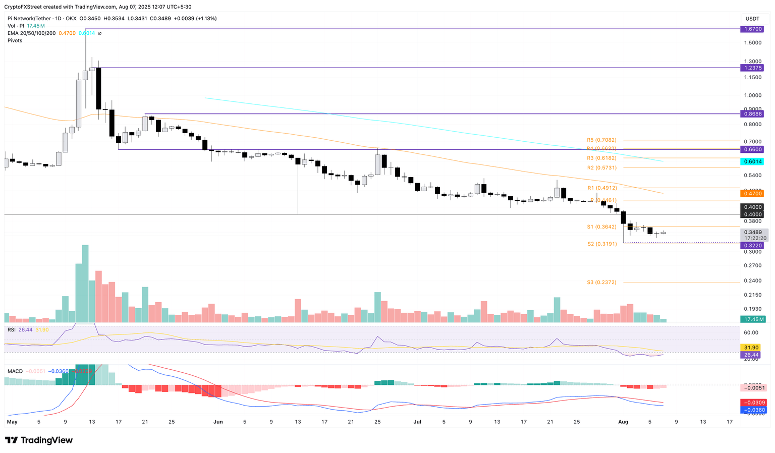 On the downside, an extended correction could test the S2 pivot level at $0.3191. In case of a decisive close below this level, the PI token could target the S3 pivot level at $0.2372.