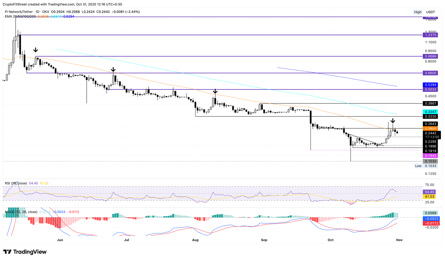 Pi Network’s fourth reversal from this average line, acting as a crucial dynamic resistance that has remained intact since May, risks erasing the gains made earlier this week. The immediate support for PI lies at the $0.2000 round figure and the $0.1919 level, marked by the October 11 low.
