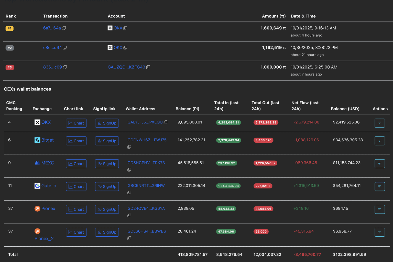 - Two large wallet investors withdrew 2.76 million PI, contributing to the CEX outflows of 3.48 million in the last 24 hours.