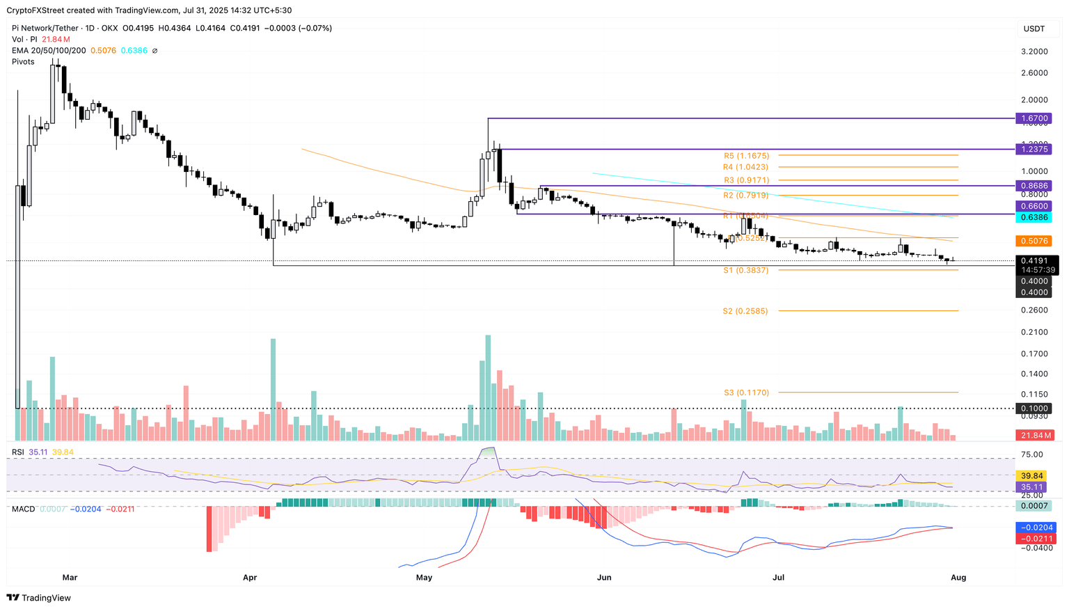 Pi Network (PI) loses steam on Thursday, trading below $0.4200 at the time of writing, falling from a daily high of $0.4364 earlier in the day. The bearish grip on PI, which has been on a clear downtrend since mid-May, tightens ahead of the 160 million token unlock in August and the delay in PI integration by Onramp Money, tilting the technical outlook bearish.