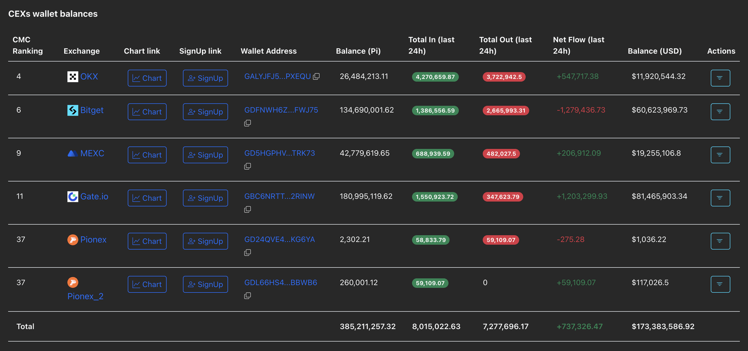 PiScan data shows a net increase of 737,326 PI tokens over the last 24 hours, while the total PI available on listed exchanges amounts to 385.21 million PI.