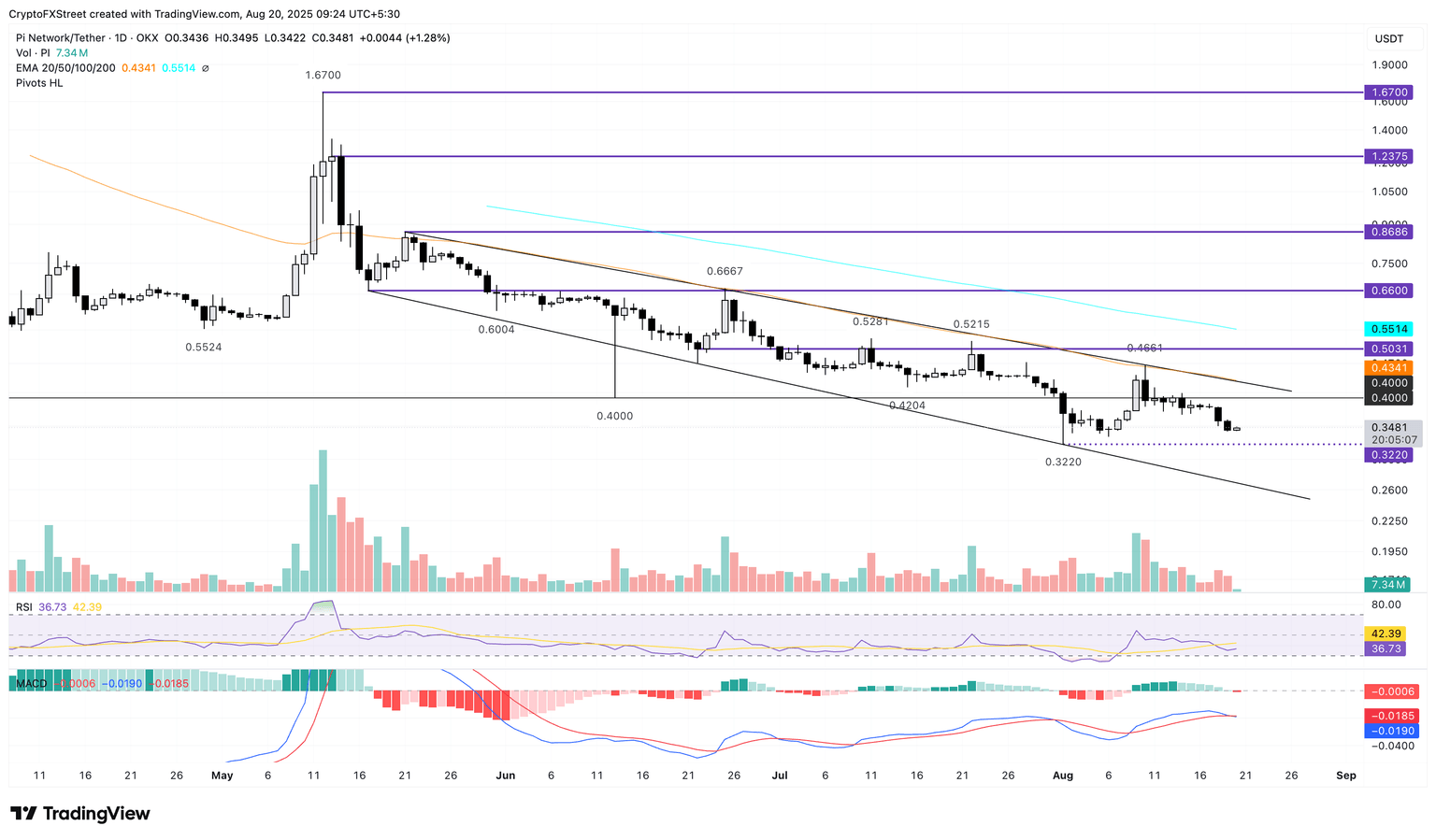 PI trades at $0.3481 at press time on Wednesday, with bulls attempting to halt the third consecutive bearish candle on the daily chart. Still, price action on the same chart highlights a pullback phase in a falling channel pattern, with bears targeting $0.3220, the all-time low recorded on August 1.