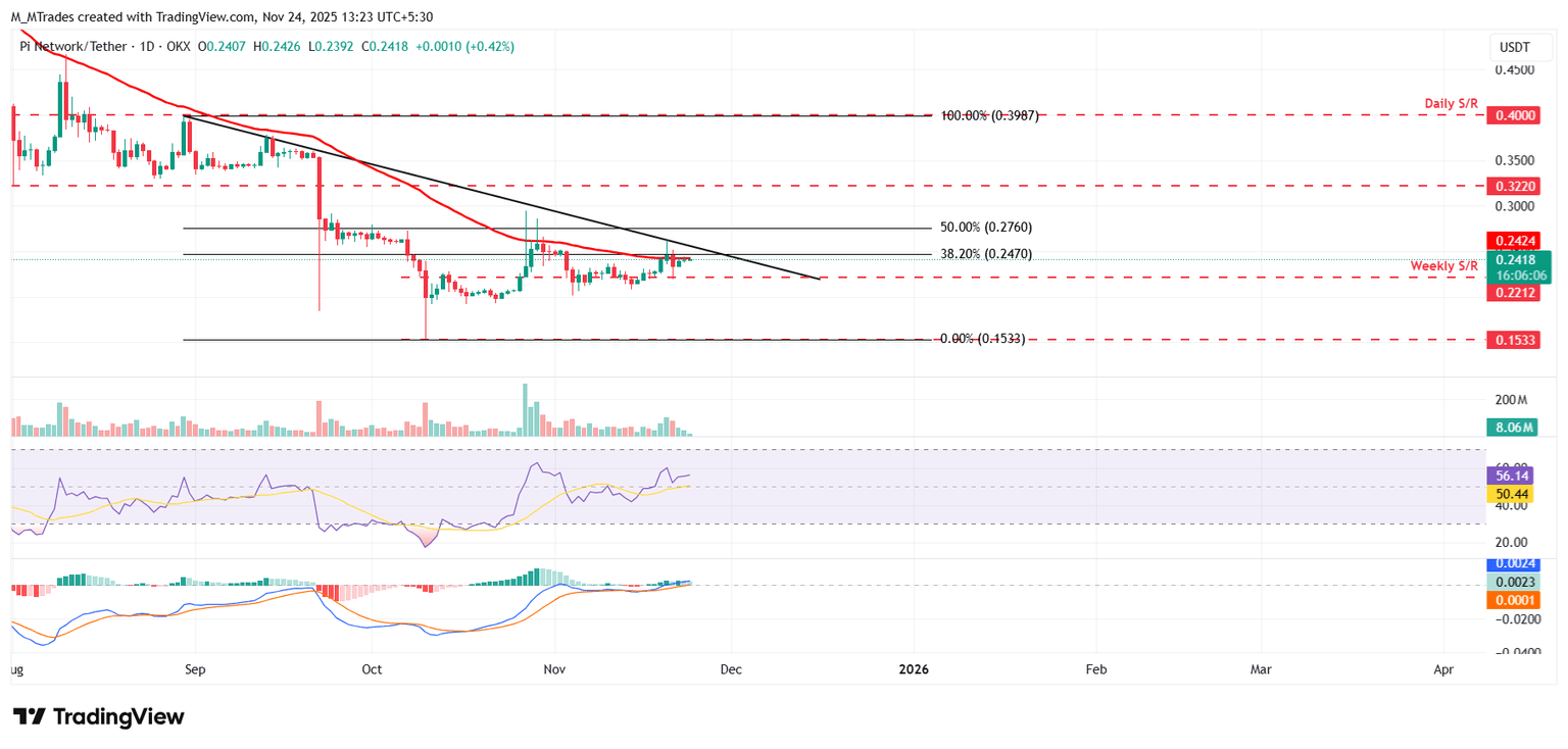Pi Network declined nearly 5% on Friday, retesting the weekly support level at $0.221, and recovered most of its losses over the weekend. At the time of writing on Monday, it nears the 50-day Exponential Moving Average (EMA) at $0.242. This 50-day EMA roughly coincides with the 38.2% Fibonacci retracement level at $0.247 (drawn from the August 30 high of $0.398 to the October 10 low of $0.153) and the descending trendline, making it a key resistance zone to watch.