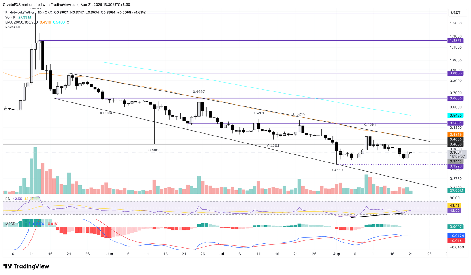 Pi Network’s PI token edges higher by nearly 1.50% at press time on Thursday, extending the 4.92% rise from Wednesday. The reversal from the $0.3442 support level hints at a double bottom pattern reversal, previously tested on August 6, targeting the 50-day Exponential Moving Average (EMA) at $0.4319.
