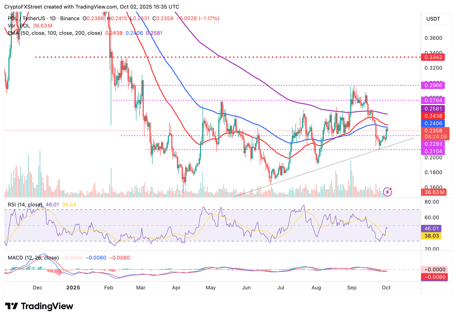 POL struggles below the key moving averages, including the 100-day Exponential Moving Average (EMA) at $0.2405, the 50-day EMA at $0.2438 and the 200-day EMA at $0.2581.