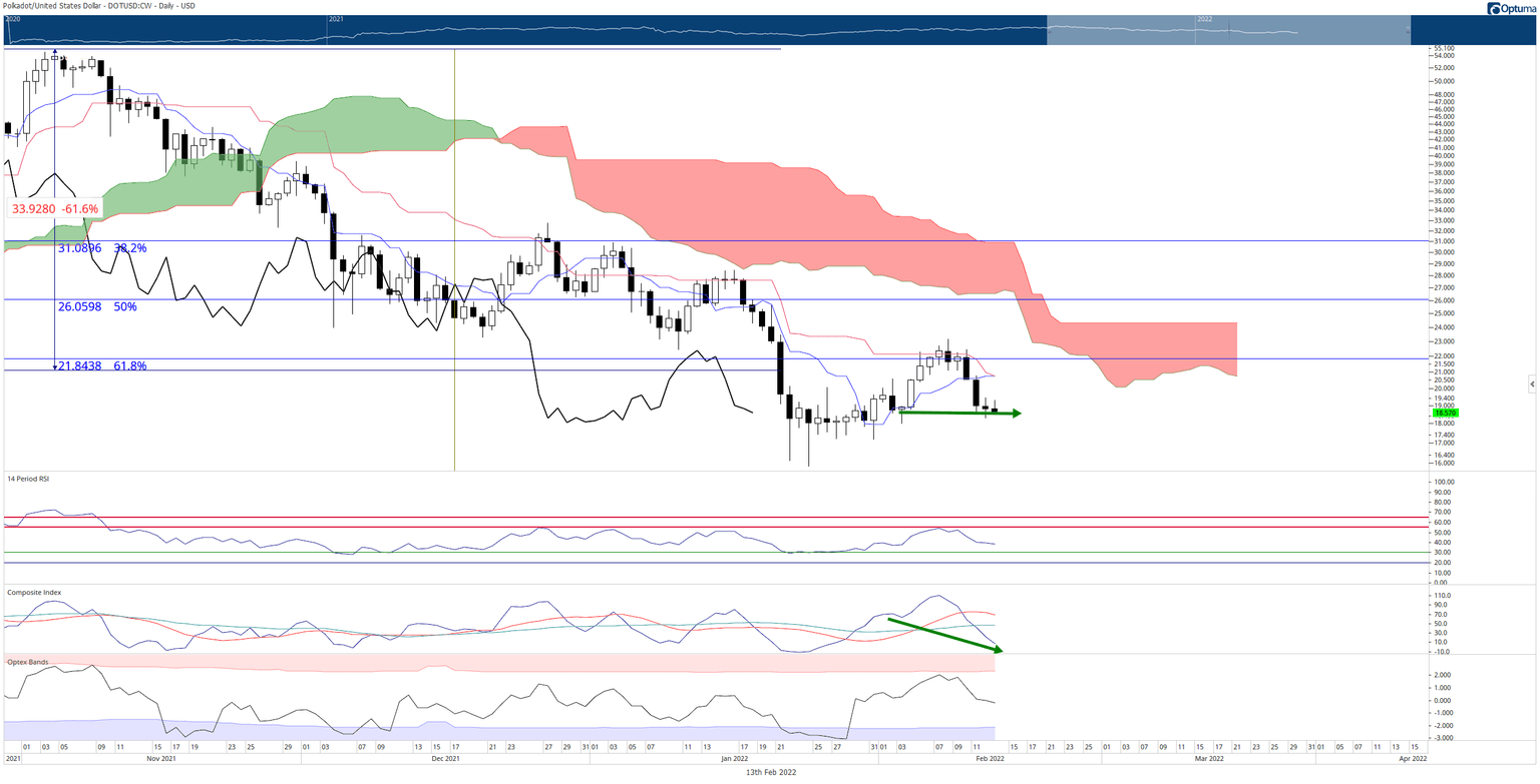 Open space required the Chikou Span to be at a price level where it won’t intercept the bodies of any candlesticks, horizontally, over the next five to ten periods. Therefore, if Polkadot price has a daily close at or below $18, then that will place the Chikou Span in open space and put Polkadot at its weakest technical level since December 3, 2021.