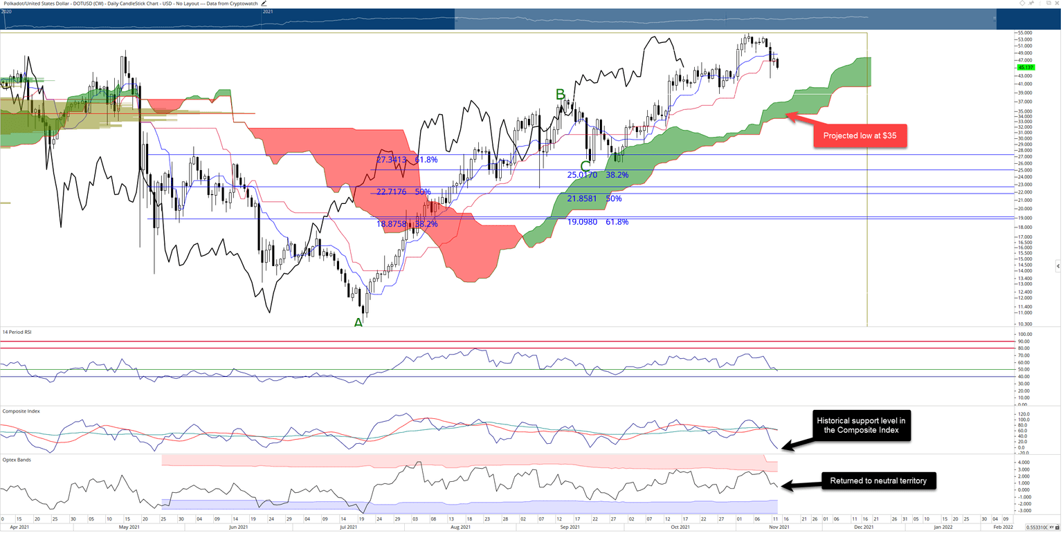- 27% drop ahead for Polkadot as little support structure exists between the Friday open and the projected low.