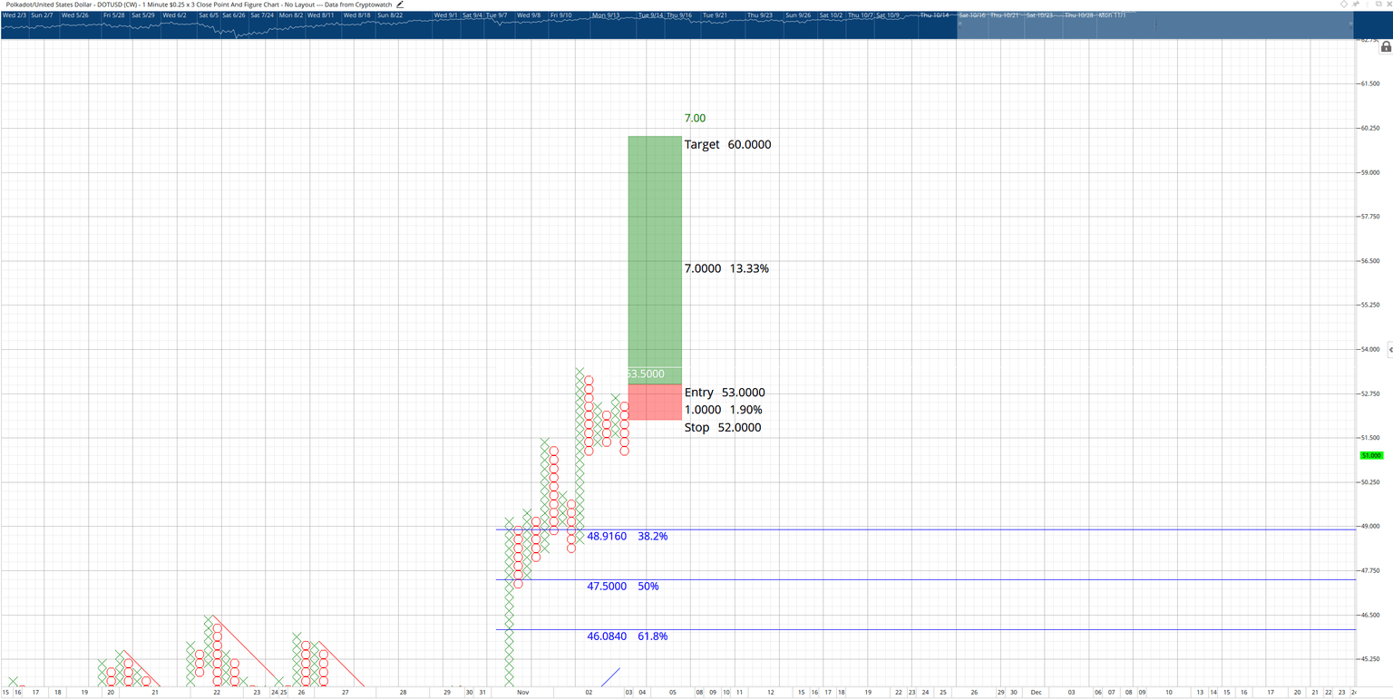 Currently, Polkadot price is already positioned to confirm a Bear Trap pattern. This will occur if a new column of X's forms and hits the entry. The hypothetical long trade is a buy stop at $53.00, a stop loss at $52.00 and a profit target at $60.00. However, if one more O forms in the current column of Os and the news X column hits the entry, that would confirm the Bearish Fakeout pattern.