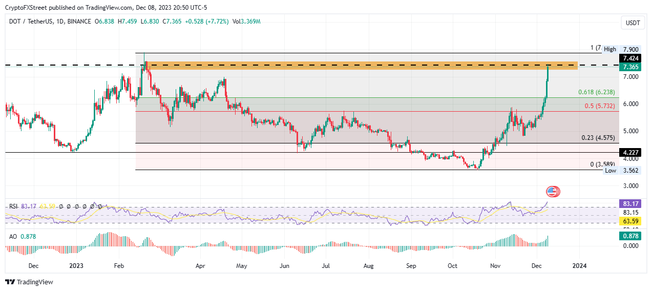 On the flip side, if the supply barrier holds as a resistance block, Polkadot price could face a rejection, retracting 5% to the $7.000 psychological or worse, retracing the most important Fibonacci level, 61.8%, at $6.238. In the dire case, the slump could extend to the 50% Fibonacci retracement level at$5.732. Such a move would constitute a 20% correction.