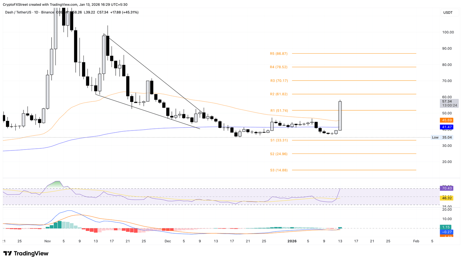 Finally, Dash records 44% gains by press time on Tuesday, surpassing the $50 mark. The DASH token aims for the R2 and R3 Pivot Points at $61 and $70, respectively.