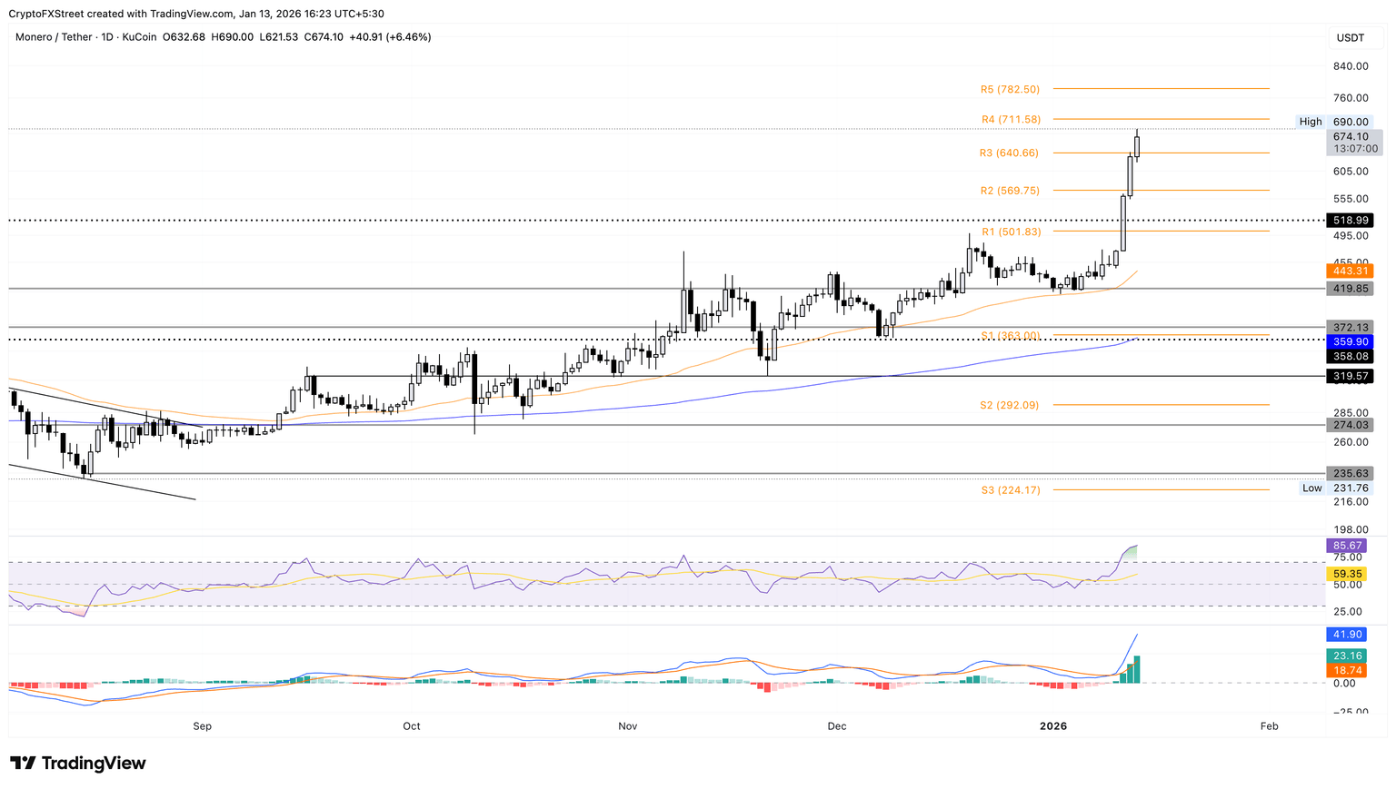The XMR rally targets the R4 Pivot Point at $711. A decisive close above could lead to the R5 Pivot Point at $782.