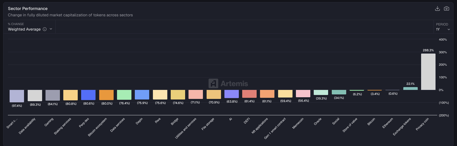 Privacy coins outperformed the broader cryptocurrency market segment, delivering 288% returns in 2025, while the exchange tokens segment recorded a 22% rise. This massive margin difference between the two segments reflects the broader market's surge in demand for privacy.