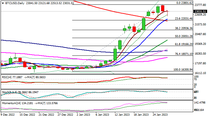 Bitcoin managed to stabilize after Thursday’s 2.7% pullback extended on Friday but find ground above strong support at 22187 (rising 10DMA), which also created a golden-cross with 200DMA and additionally underpin the action.