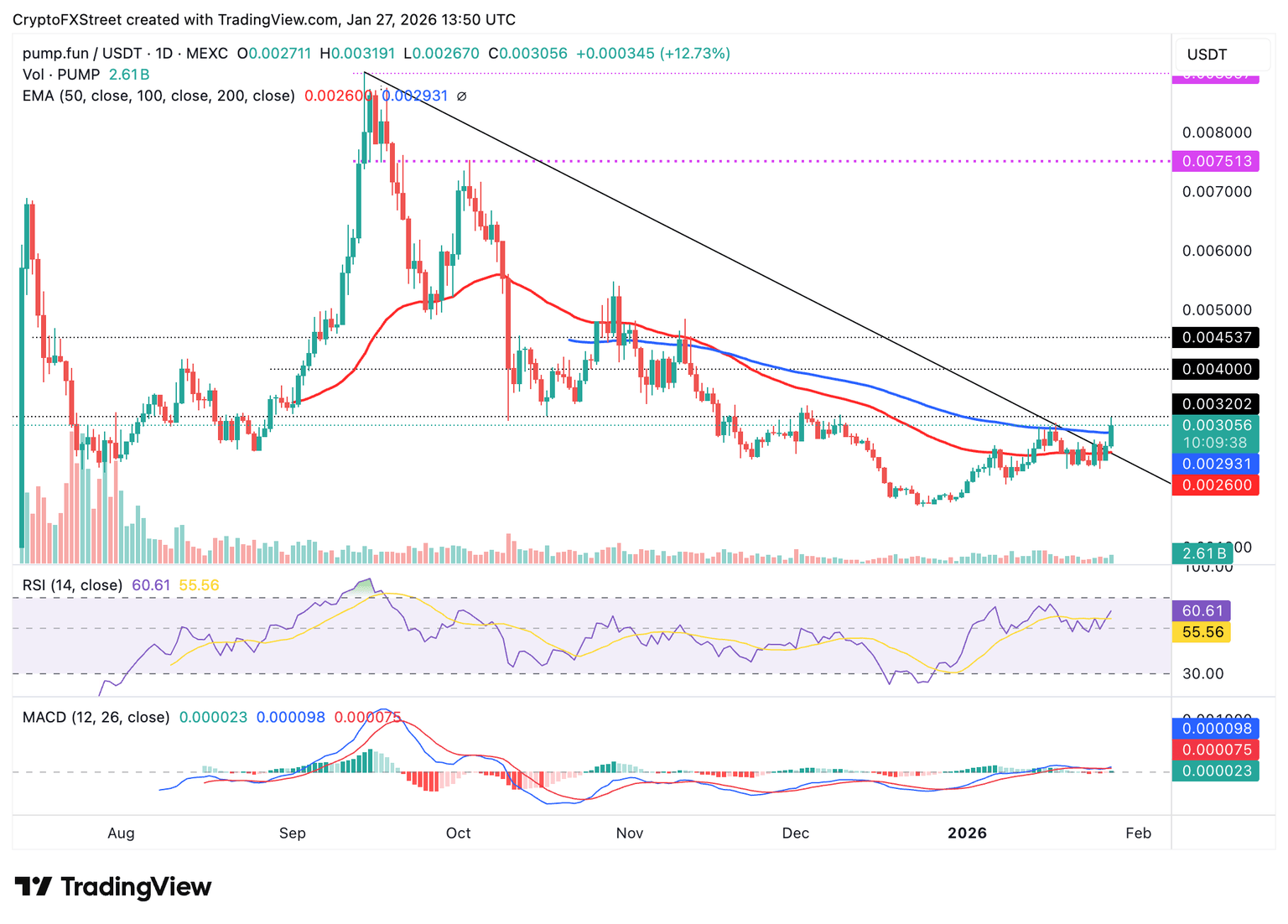 Still, traders should be cautious amid possible profit-taking, microeconomic uncertainty, and geopolitical tensions, which could push PUMP below $0.00300. The 100-day Exponential Moving Average (EMA) is poised to absorb selling pressure at $0.00293 and the 50-day EMA at $0.00260.