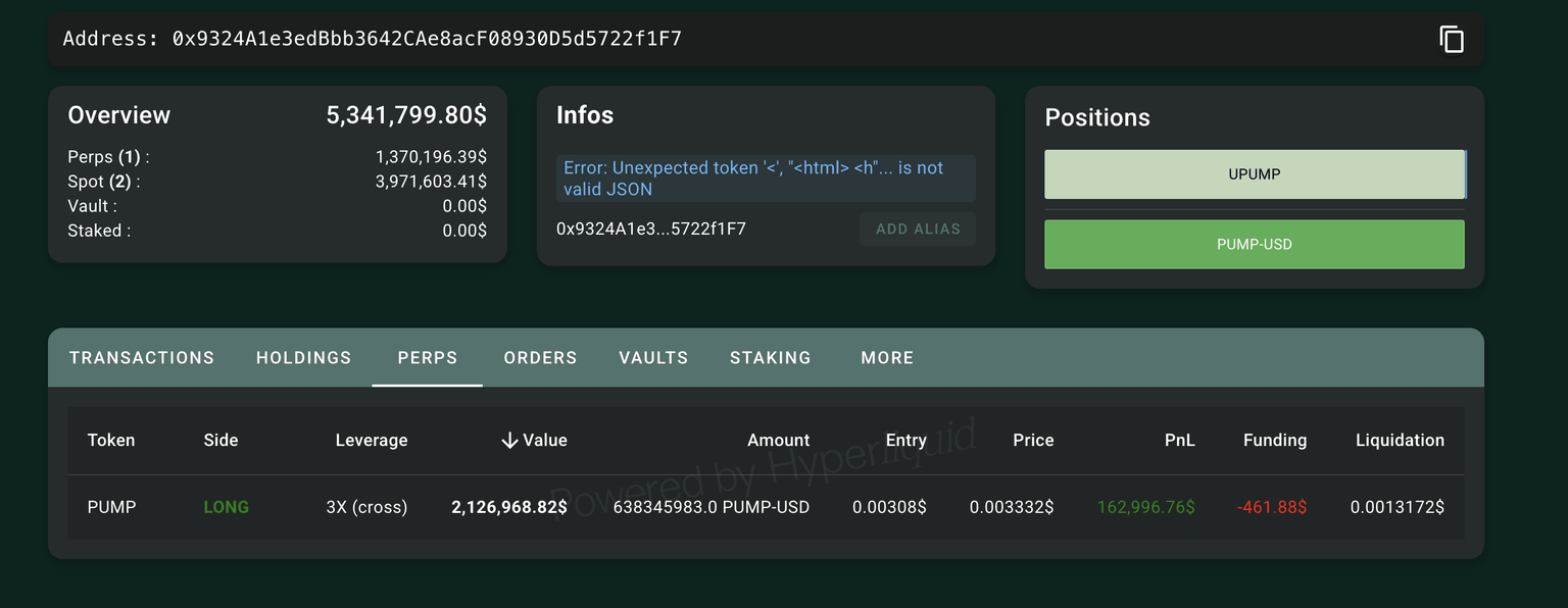 Despite the broadly stable revenue, a whale anticipating a reversal run has opened a long position of 594 million PUMP tokens leveraged by 3x on Hyperliquid, worth $1.83 million. The whale acquired 1.06 billion PUMP tokens from the spot market.