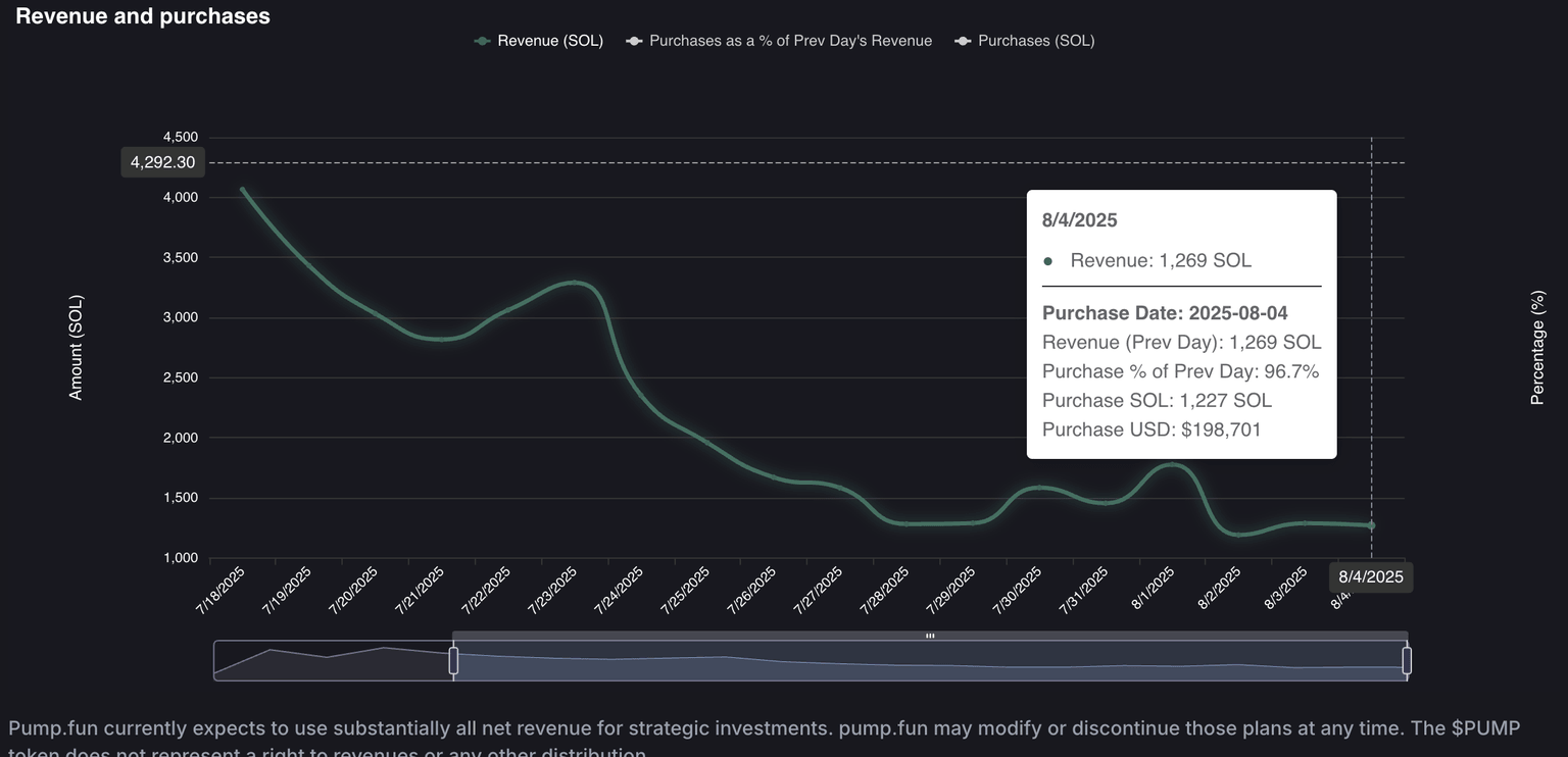 Pump. Fun’s revenue dashboard reflects a broadly stable revenue, as it moves flat at 1,269 SOL. Still, investors may consider the meme coin hype is fading, as revenue has tanked from the 5,091 SOL seen on July 17.