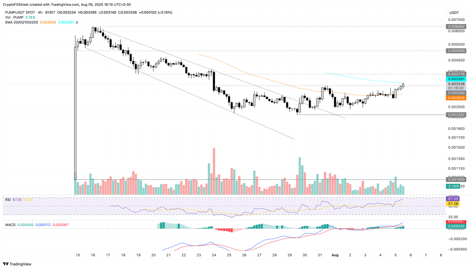 PUMP recovery run surpasses the $0.003260 resistance level on the 4-hour chart, last tested on Thursday, signaling a potential range breakout. Prices should mark a decisive candle close above this level to support the uptrend.