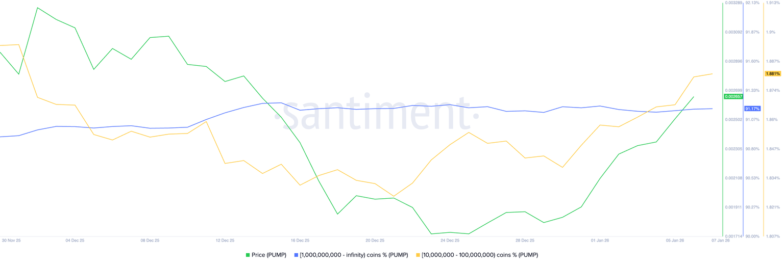 On-chain data shows that large-wallet investors hold steady as increased activity from mid-sized wallets drives the PUMP price. According to Santiment, holders with over 1 billion PUMP tokens hold over 91% of the on-chain supply.