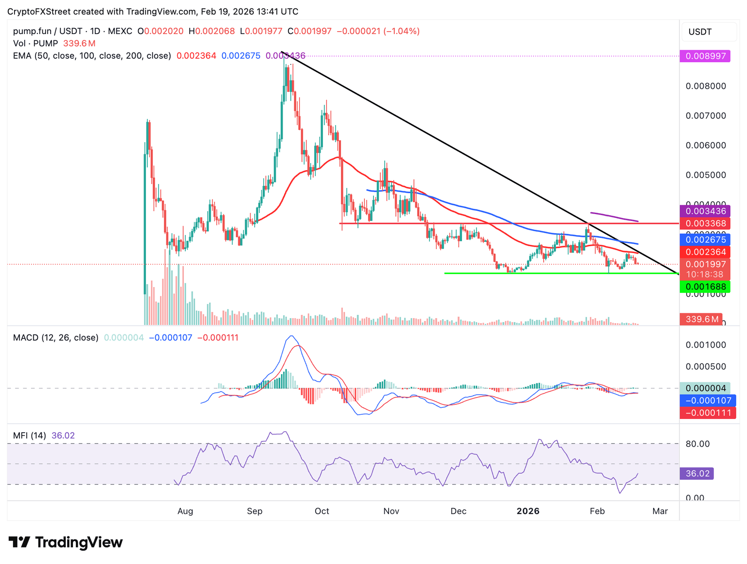 Pump.fun (PUMP) is edging lower alongside crypto majors like Bitcoin (BTC) and Ethereum (ETH), trading at $0.0019 at the time of writing on Thursday. The meme coin launch and trading platform’s native token marks three consecutive days in the red amid a deteriorating technical picture.