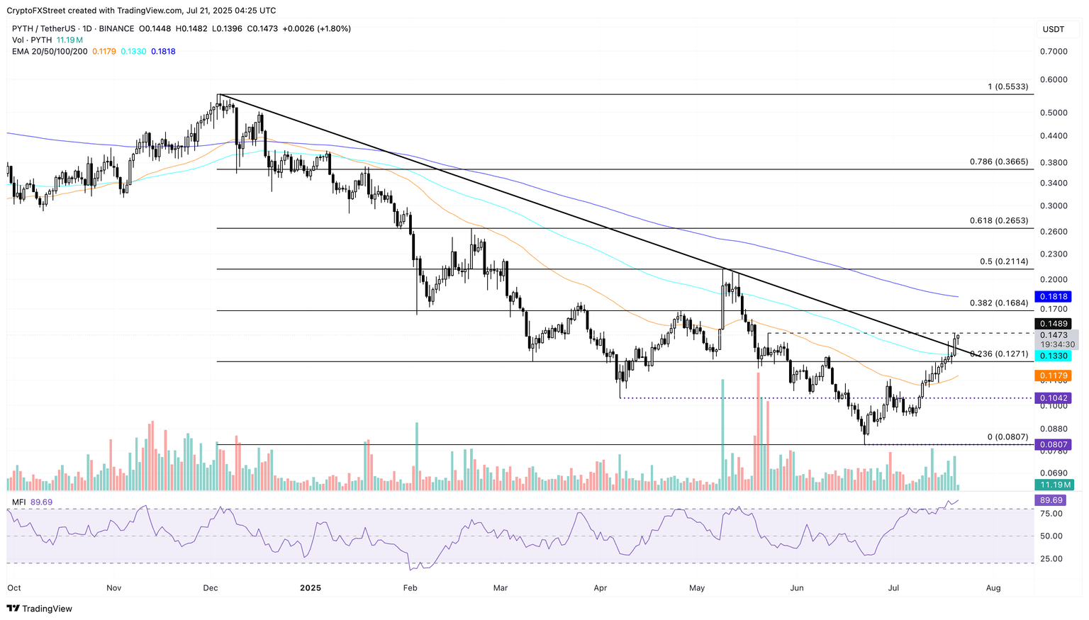 Pyth Network edges higher for the seventh successive day by nearly 2% so far on Monday, adding on the 9.87% rise from Sunday. The bull run exceeded the 100-day Exponential Moving Average (EMA) at $0.1330 and the eight-month long resistance trendline (formed by connecting the December 3 and May 14 highs) at $0.1371.