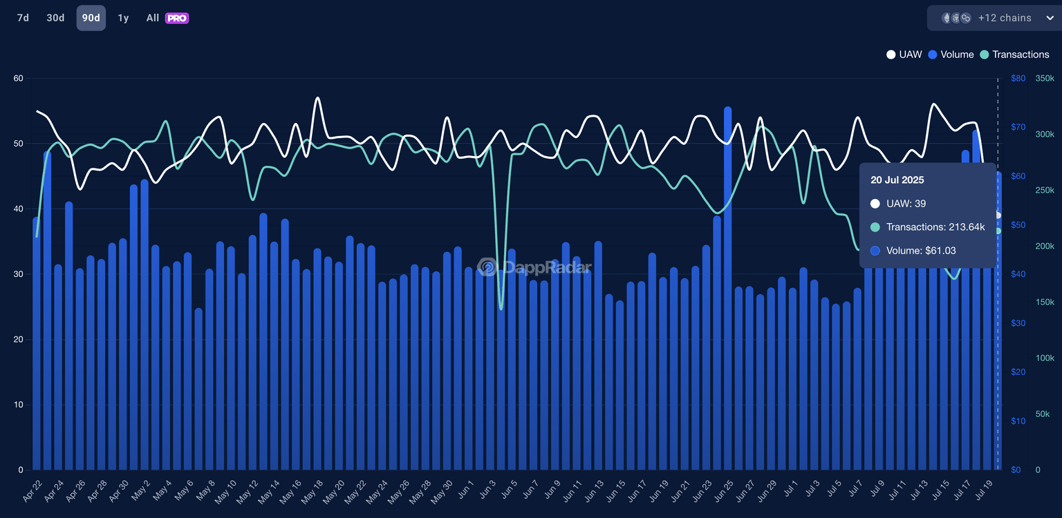 DappRadar’s data shows heightened activity on the Pyth Network in the last 90 days. Pyth Network recorded 213.64k daily transactions on Sunday, up from the low of 170.89k transactions on Wednesday.