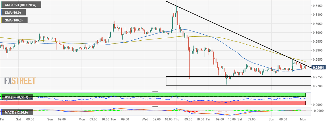 Ripple is pushing the weekend consolidation a notch higher on Monday. This follows Friday’s gravitational movement that touched $0.27 support. A shallow recovery took place over the weekend session but it was dominated by a sideways consolidative action. Besides, the upside was greatly capped at $0.2850.