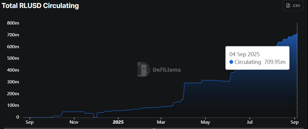 - DeFiLlama’s on-chain data shows that the RLUSD supply continues to expand, currently standing at 709.95 million.