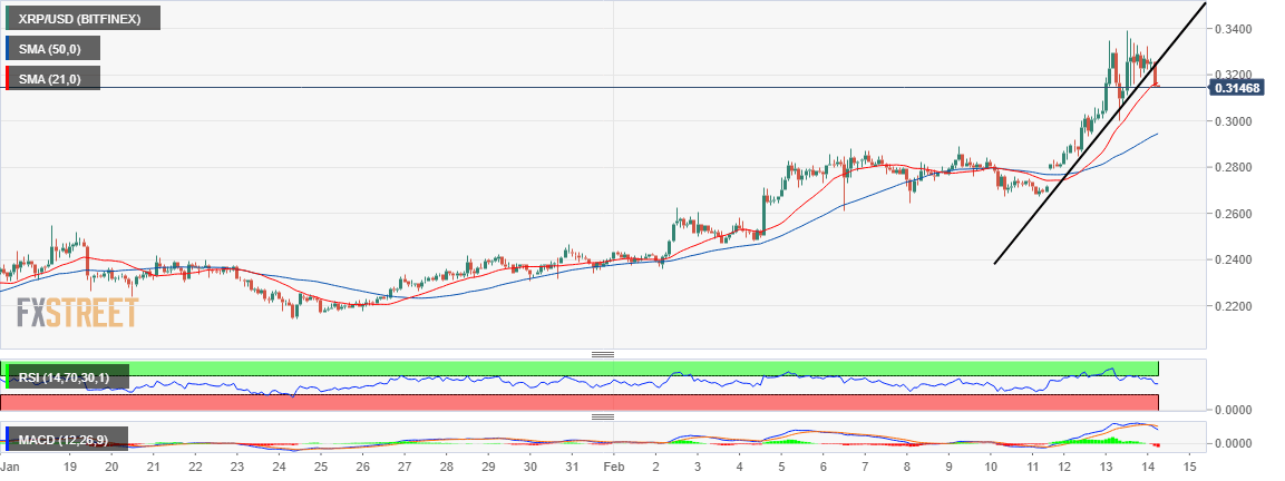 Ripple price has broken under a short term ascending trendline. Technical analysis shows that the bearish momentum could last longer. The RSI, for instance, is pointing south after the break down below the overbought region. If the next support at $0.31 is cleared, XRP is likely to retest the key hurdle at $0.30. Moreover, the MACD’s bearish divergence is anything go by, the bulls will have a hard time relaunching XRP towards $0.34 resistance area.