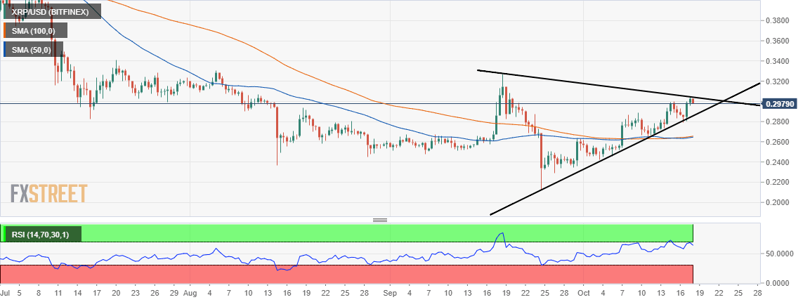 Interestingly, Ripple price is trading above he Simple Moving Averages (SMA). The 50 SMA on the 720-minutes chart and the 1000 SMA have been functioning as support areas since Ripple October 7 when XRP extended the gains from the September lows under $0.20.