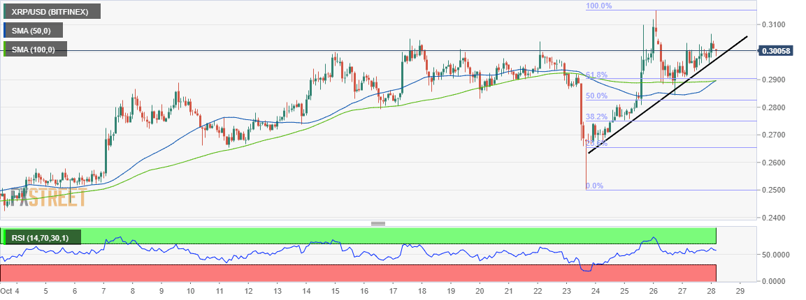 Ripple price managed to clear the resistance at $0.30 and even touched $0.315 following the euphoria Bitcoin (BTC) impressive rally above $10,000. The 61.8% Fib retracement level taken between the last swing high of $0.315 to a swing low of $0.25 is forming confluence support with the 50 Simple Moving Average (SMA) on the two-hour chart and the 100 SMA at $0.29.