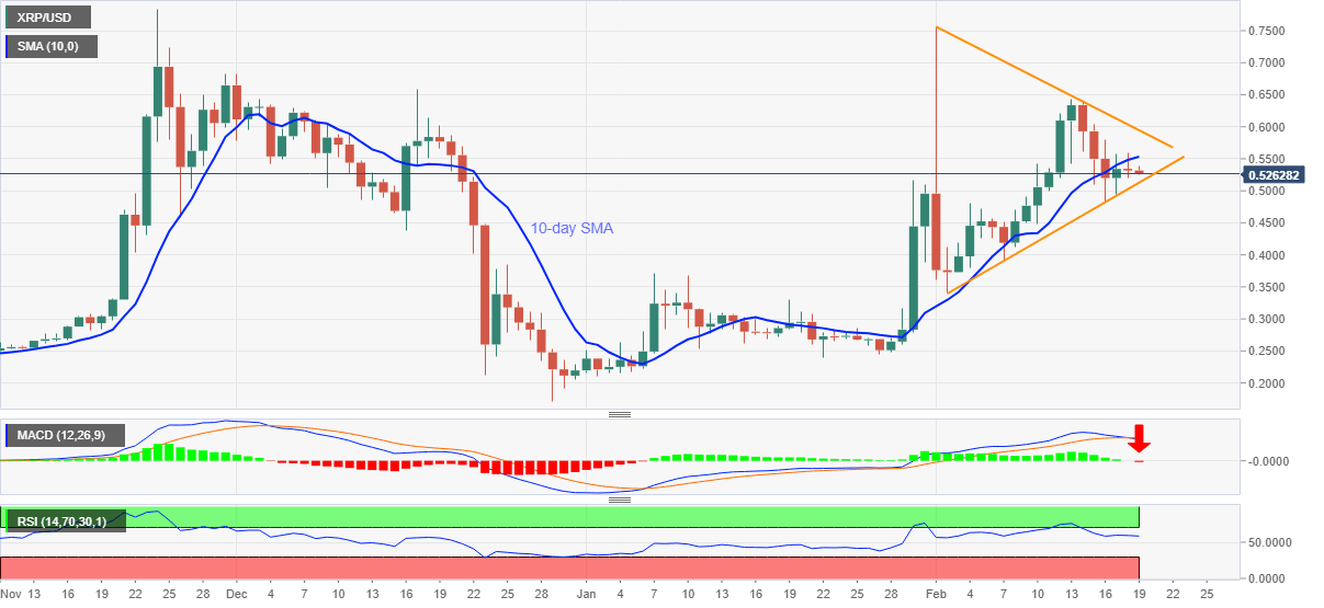 XRP/USD drop to $0.5270 while extending the previous day’s pullback to early Friday. The altcoin’s latest weakness could be traced from its repeated failures to cross 10-day SMA as well as the first bearish MACD signal since the early January.
