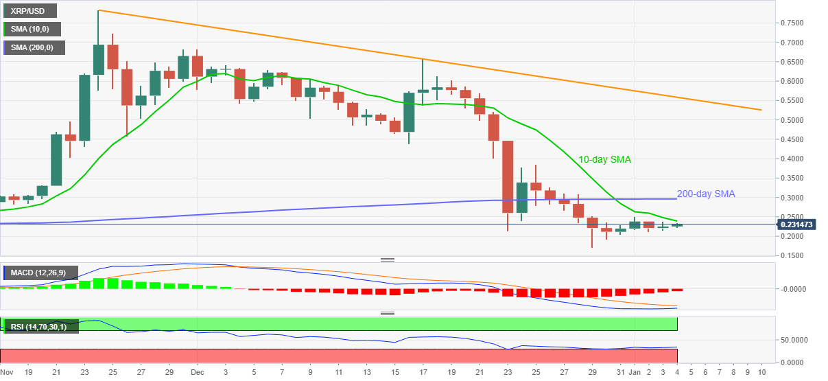 XRP/USD picks up bids near 0.2300, currently up 2.73% near 0.2310, during early Monday. In doing so, the ripple buyers attack 10-day SMA while stretching corrective pullback from December lows, also the lowest since June 2020.