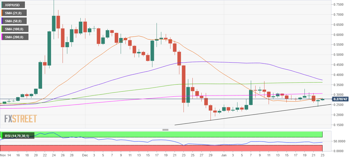 Ripple’s daily chart shows that the bulls are trying hard to recapture the 21-daily moving average (DMA) at $0.2826, in order to revive the recovery momentum.