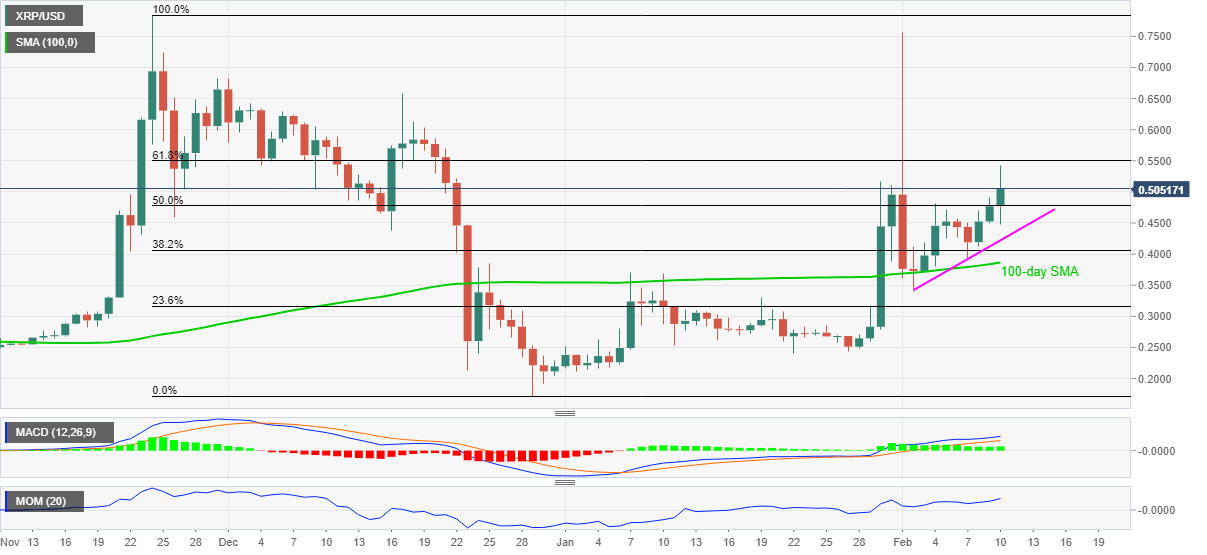 XRP/USD picks up bids to 0.5070 as crypto traders prepare to close Wednesday’s books. The ripple pair rose to the highest since February 01 during the early hours of the day before stepping back from 0.5422. Though, the pullback couldn’t drag the quote below 50% Fibonacci retracement of November-December 2020 downside, needless to mention breaking the immediate support line and 100-day SMA.