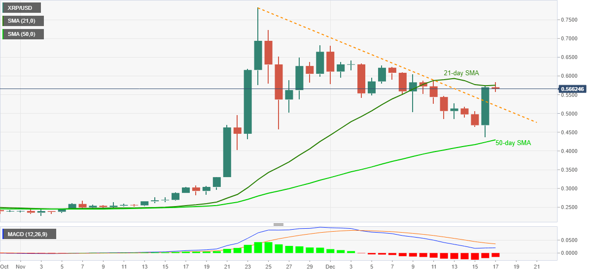 XRP/USD picks up the bids near 0.5660 during early Thursday. In doing so, the pair cheers its upside break of a key resistance while attacking the 21-day SMA to extend the rise.