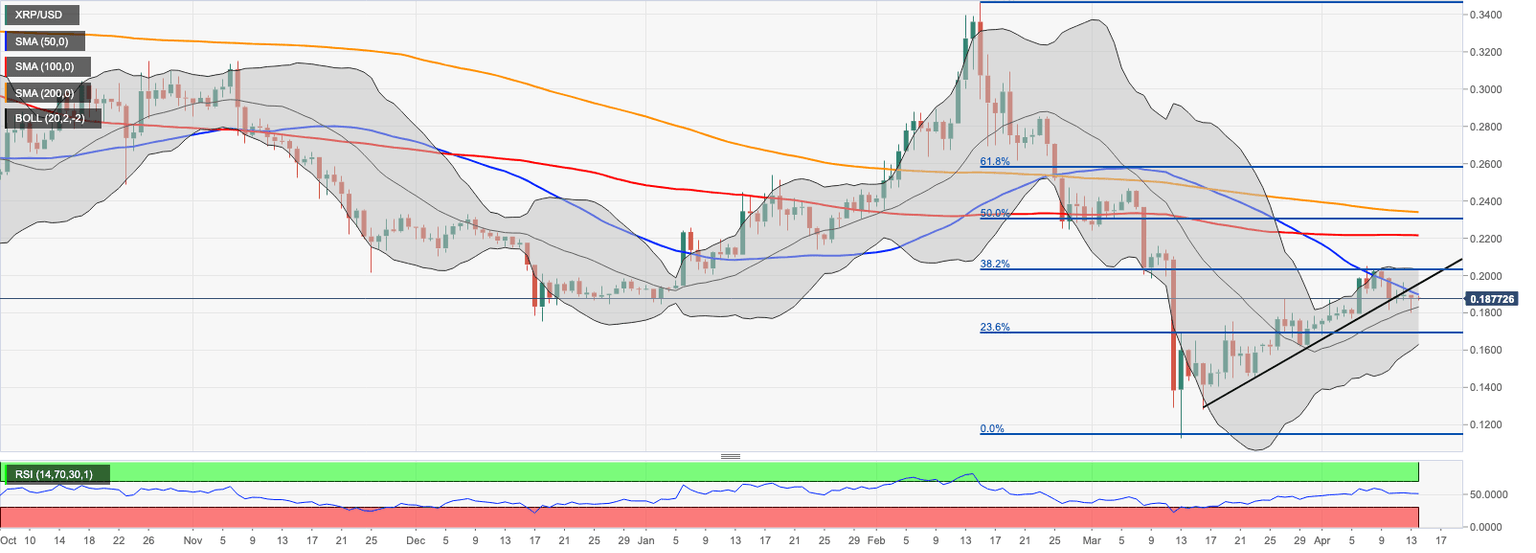 On a daily chart, XRP/USD is still moving below the upside-looking trendline (currently at $0.1940). A failure to get back above this barrier will weaken XRP's chances to get the recovery back on track and put the recovery from March 13 low at risk. Meanwhile, the psychological barrier $0.1900 is reinforced by daily SMA50, which means XRP bulls will have a hard time trying to claw back some ground.