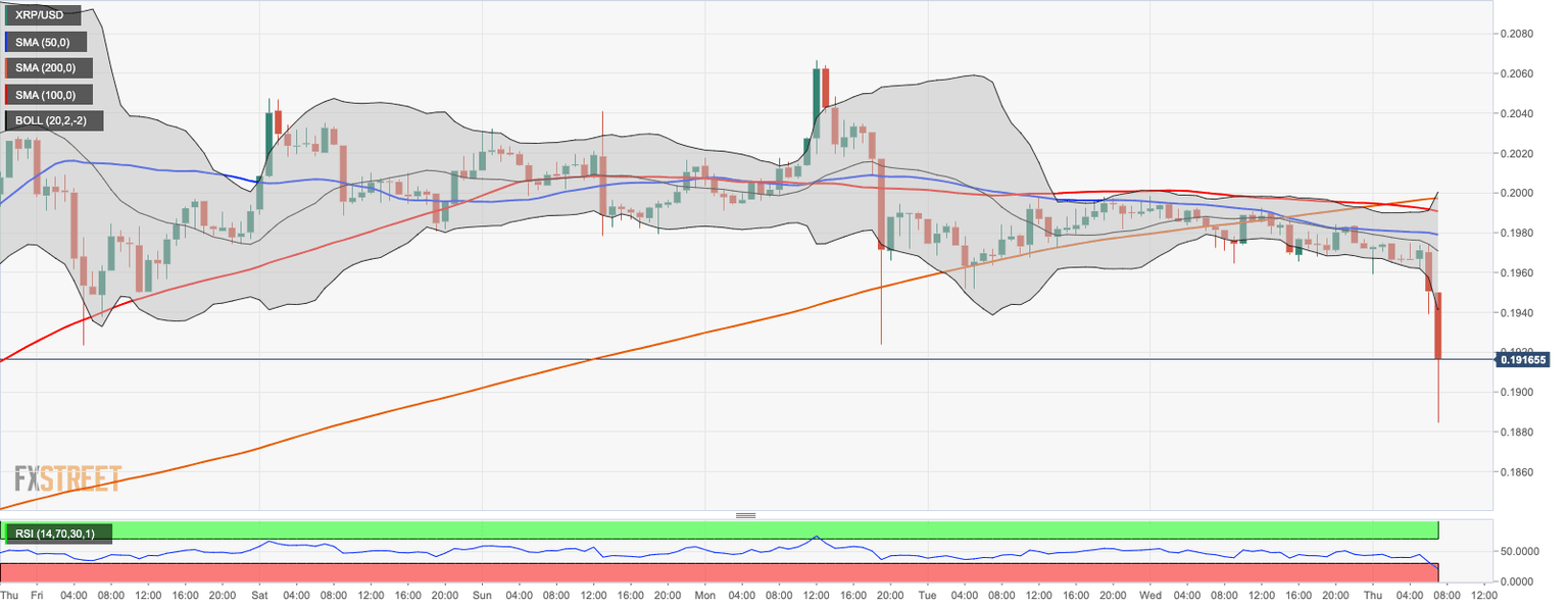 Ripple's XRP is down 3% since the start of the day. The coin has resumed the decline after a prolonged period of range-bound trading in a narrow channel with the lower boundary created by the daily SMA100. At the time of writing, XRP/USD is changing hands at $0.1911 moving within a short-term bearish trend.